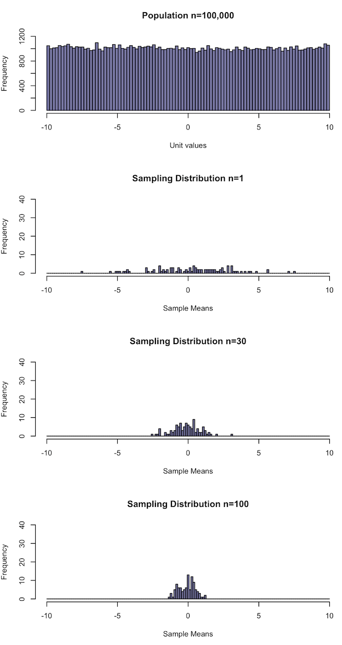 In the figure below, I simulated (in R) the sampling distributions of a uniformly-shaped population (upper panel). The three lower panels show the distributions of means for samples with n=1 (unique observation), n=30, and n=100. We see that, although noise remains, the distribution converges to normality as samples increase in size, although the population has a uniform structure.