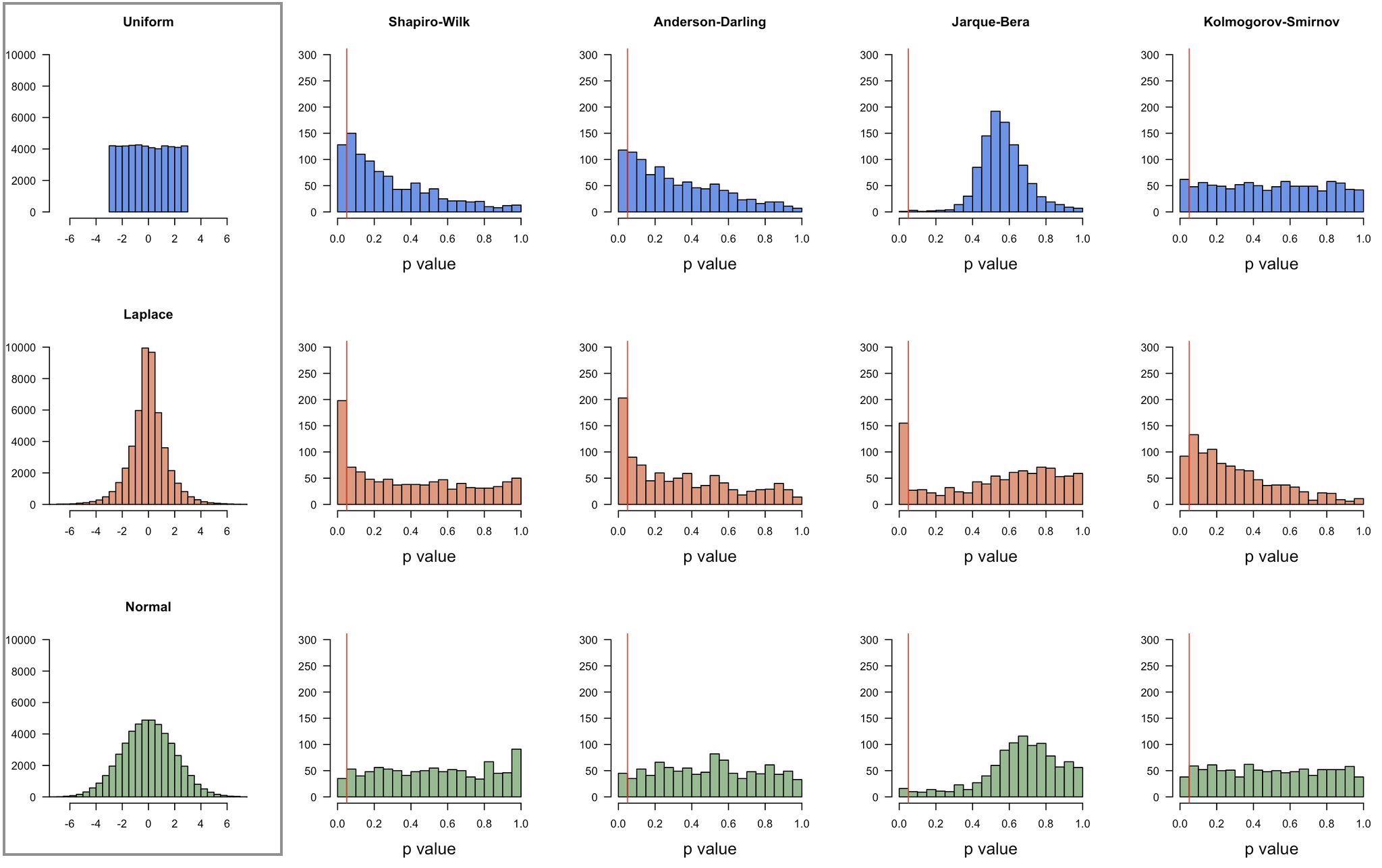 However, this reasoning is flawed. Why? Because in small samples, tests of normality are globally underpowered. This means that the tests would hardly return statistically-significant results, even in case the data was indeed sampled from a non-normal population. The figure below shows simulations (implemented in R) of 1000 repeated tests with n = 15, drawn from uniform, Laplace and normal distributions (these parent distributions are highlighted with a grey rectangle). For each distribution, four tests of normality are interrogated: Shapiro-Wilk, Anderson-Darling, Jarque-Bera, and Kolmogorov-Smirnov. Naively, we would expect a very strong right skew for the eight upper distributions where tests were used on data from uniform and Laplace variables, indicating that a majority of tests returned small p-values. In parallel, we would expect flat distributions for the bottom ones where the normal variable was sampled.